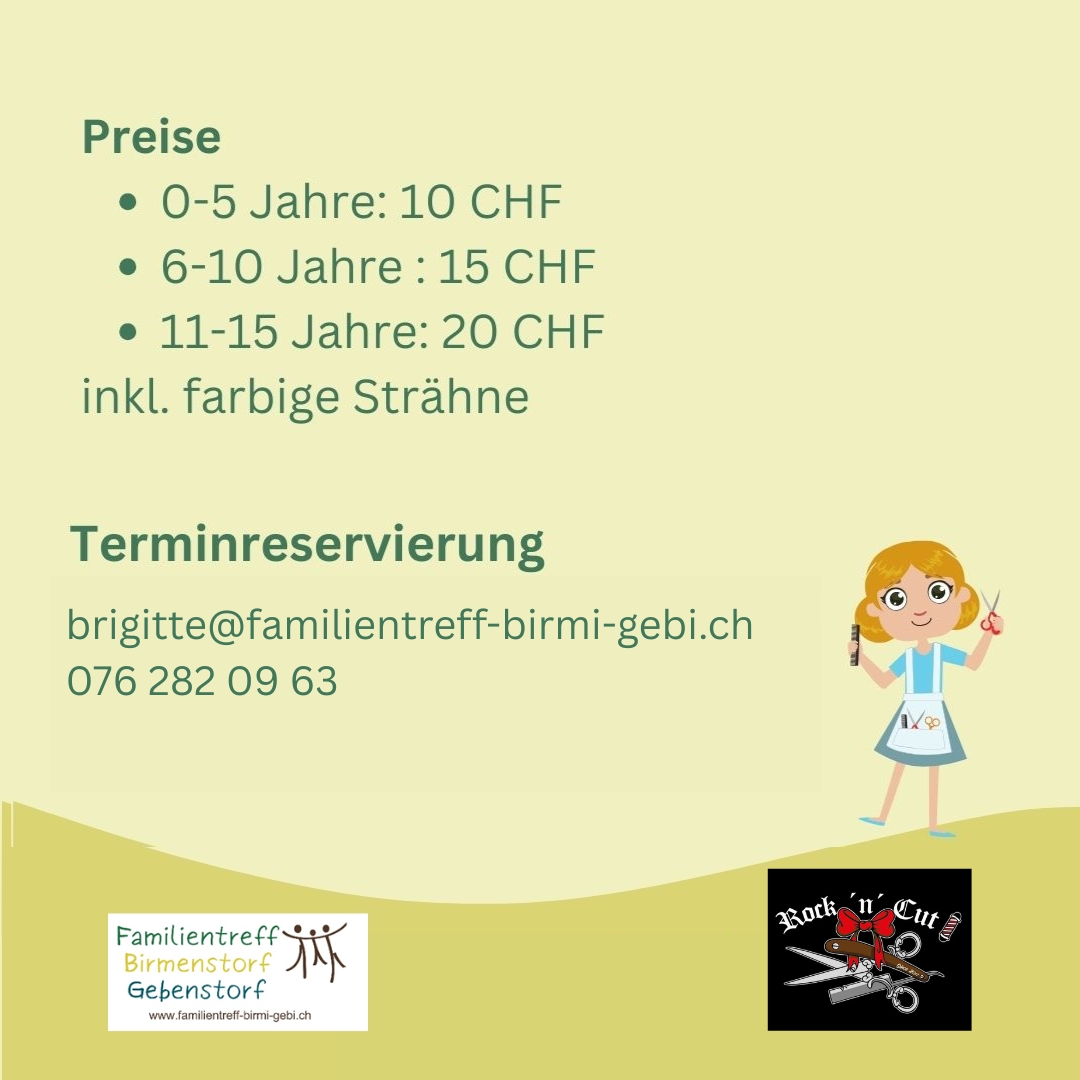 Familientreff Birmenstorf Chileweg 2, Birmenstorf, SwitzerlandIst Haareschneiden für dein Kind eine unangenehme Angelegenheit? Wünschst du dir mit deinem Kind einen möglichst stressfreien Besuch beim Coiffeur? Dann bist du bei uns im Familientreff Birmenstorf goldrichtig! Am Samstag, 10. Januar 2026 von 13:30 - 16:00 Uhr kommt unsere erfahrene Frisörin Barbara Lüthy bei uns im Familientreff vorbei und zaubert wundervolle Frisuren - ohne Frust oder Tränen. Reserviere dir gleich deinen Termin für den Samstag, 10. Januar 2026-…