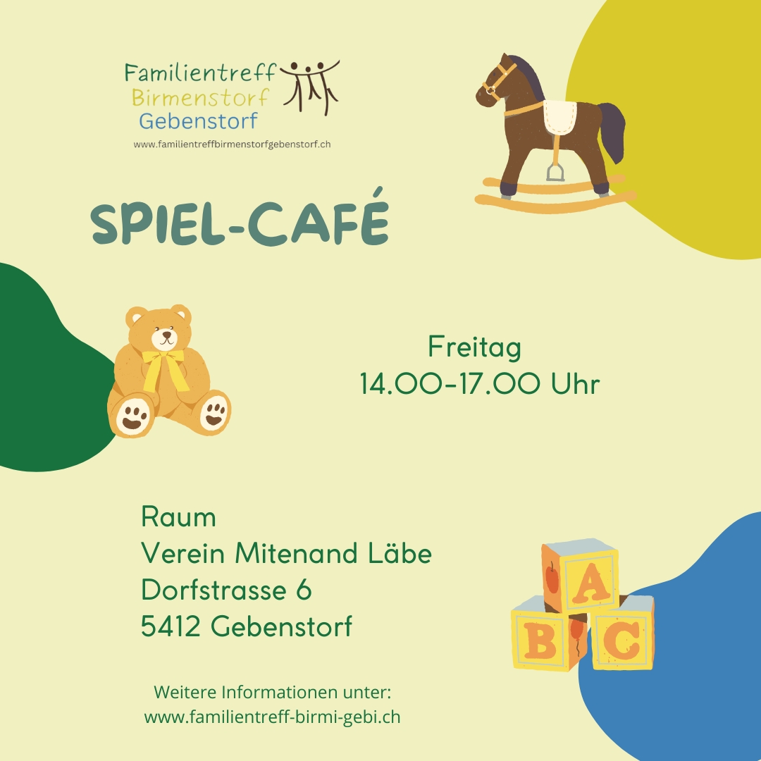 Familientreff Gebenstorf Dorfstrasse 6, Gebenstorf, Aargau, SwitzerlandAm Freitag sind die Türen wieder geöffnet vom Spiel-Café. Die Kinder können im Spielbereich spielen, während die Grossen einen Kaffee geniessen. Kleine Snacks gibt es auch. Neu am Freitag in Gebenstorf! Wir freuen uns!