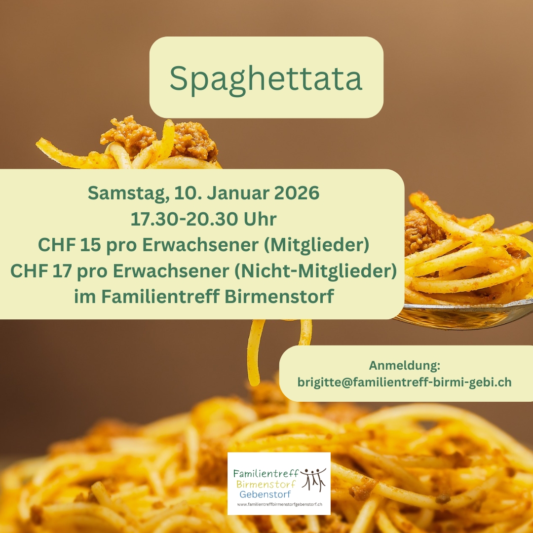 Familientreff Birmenstorf Chileweg 2, Birmenstorf, Switzerland🍝 Spaghettata im Familientreff Birmenstorf 🍝Am Samstag, 10. Januar 2026 laden wir euch herzlich ein, gemeinsam zu essen, zu lachen und einen gemütlichen Abend zu verbringen. 🕠 17.30–20.30 Uhr💰 CHF 15 (Mitglieder) | CHF 17 (Nicht-Mitglieder)📍 Familientreff Birmenstorf 👉 Anmeldung: brigitte@familientreff-birmi-gebi.ch Wir freuen uns auf euch! 💛